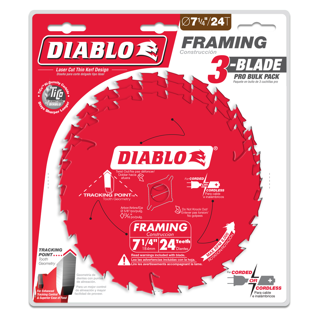Crafted for exceptional performance in both corded and cordless applications, this 7-1/4 inch framing saw blade set from Diablo Tools includes three blades that promise improved cutting efficiency. Each blade features a Tracking Point™ tooth design, which not only enhances cutting precision but also extends the cutting life significantly — offering up to five times longer durability compared to standard blades in nail-embedded wood. The laser-cut thin kerf minimizes resistance for effortless cuts, while the Perma-Shield non-stick coating effectively guards against heat and corrosion.