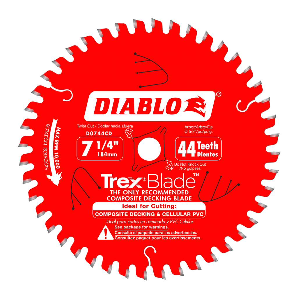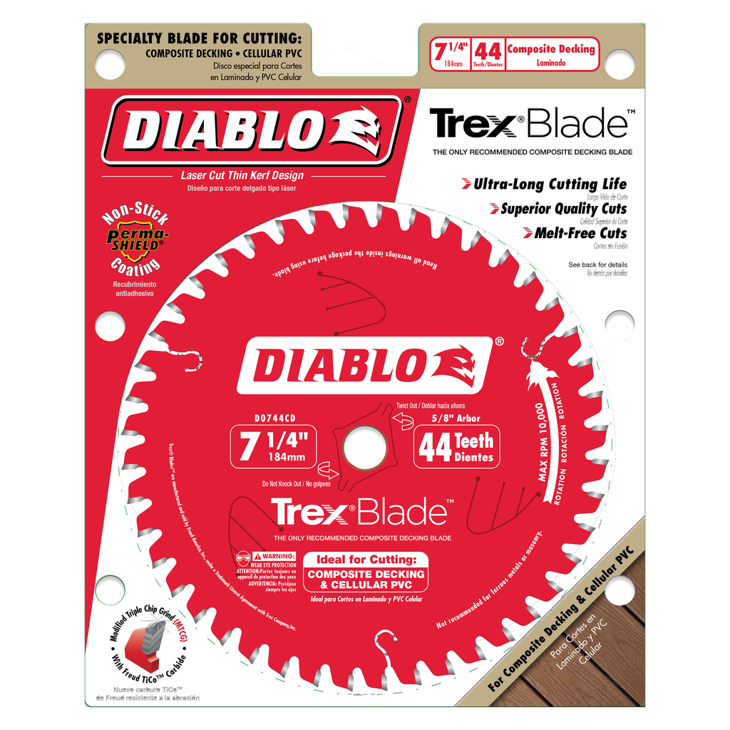 Diablo’s TrexBlade is the only recommended composite decking by Trex Company when cutting composite decking materials. These new blades deliver maximum performance and highest quality of finish; making it a ‘must-have’ tool for both professionals and DIYers planning composite decking projects. Diablo’s new saw blade series has a modified triple chip tooth grind design, Perma-SHIELD® non-stick coating, and specific TiCo™ Hi-Density carbide to deliver more efficient and cleaner cuts with no swirl marks, less “gumming” of blade teeth and longer cutting life .