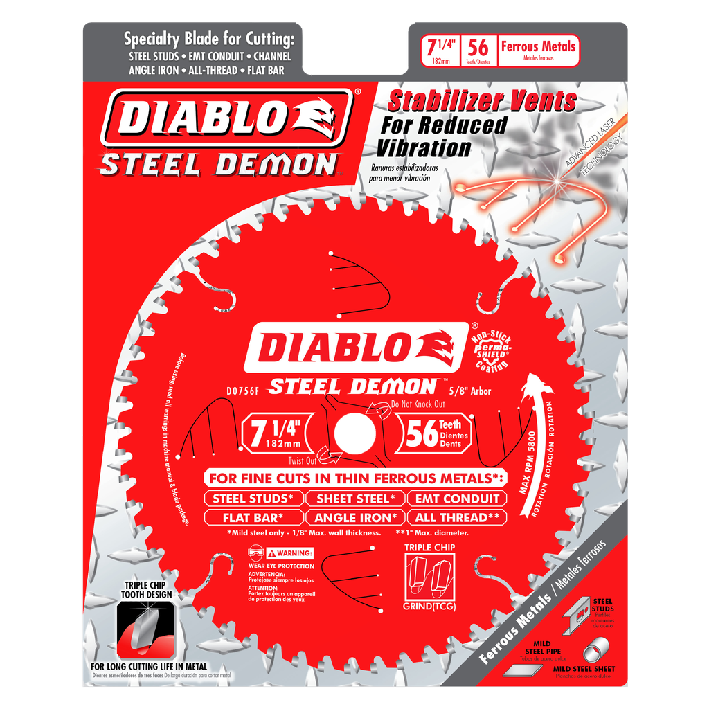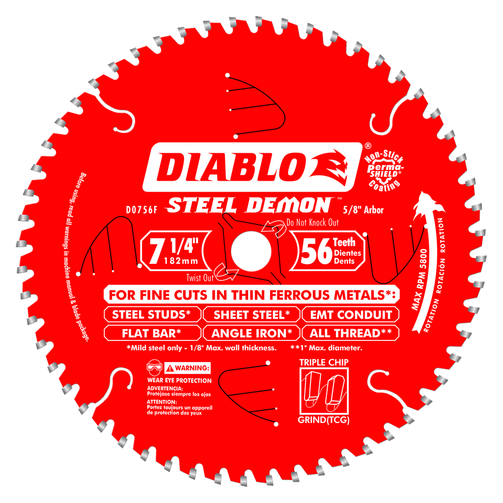 Steel Demon saw blades are specially designed for the extreme demands of ferrous metal cutting; thereby enabling precise cuts without sparks, heat or burred edges that result from using abrasive blades. With up to 40X the life of standard abrasive disc, Steel demon delivers unparalleled performance and superior quality cuts. Blades feature Freud’s TiCo Hi-Density Carbide, Laser cut bodies, Anti-vibration technology, Perma-Shield Non-Stick Coating, Triple Chip Design, and pretensioned blades. Diablo’s blade is designed to fit 7-1/4-Inch Circular Saws.