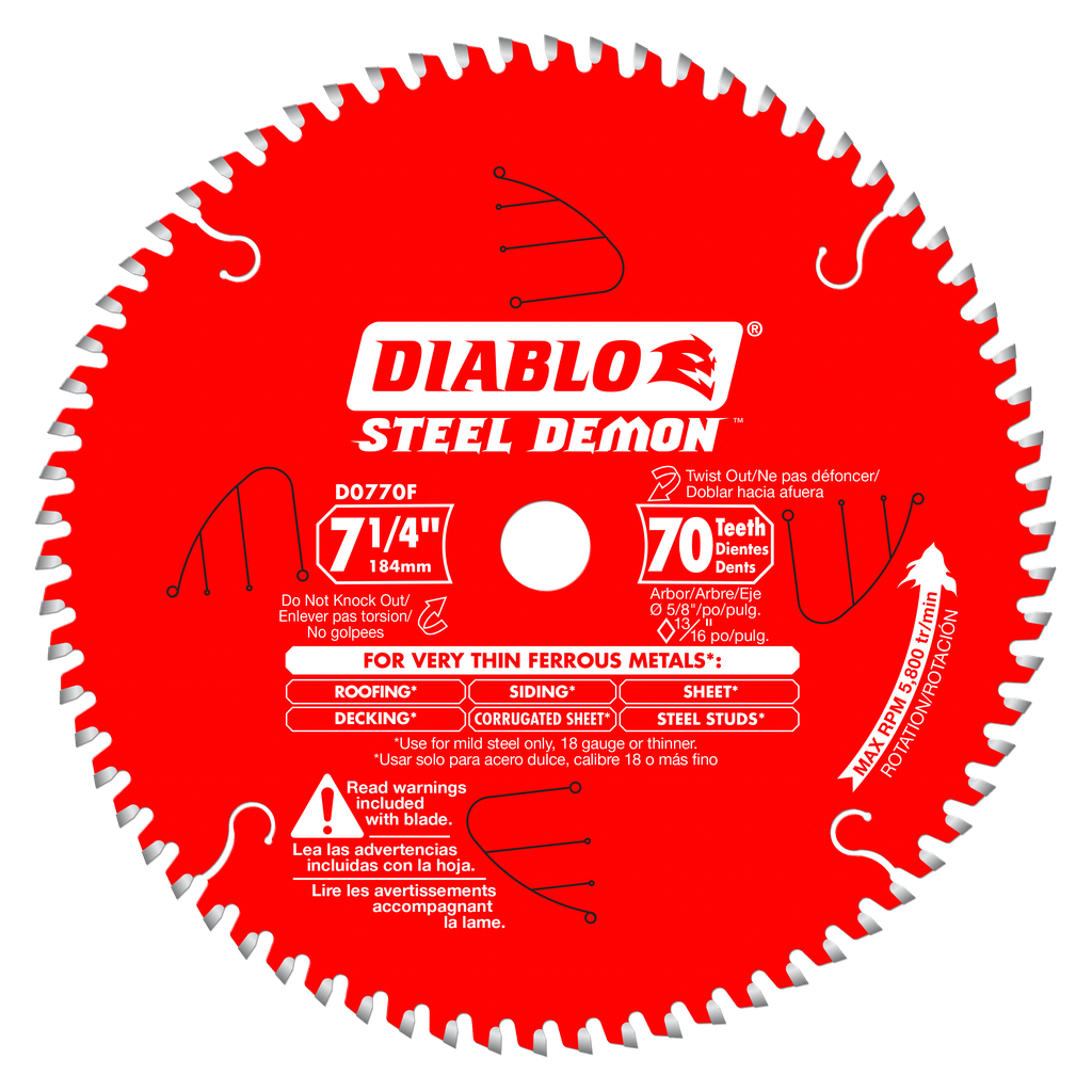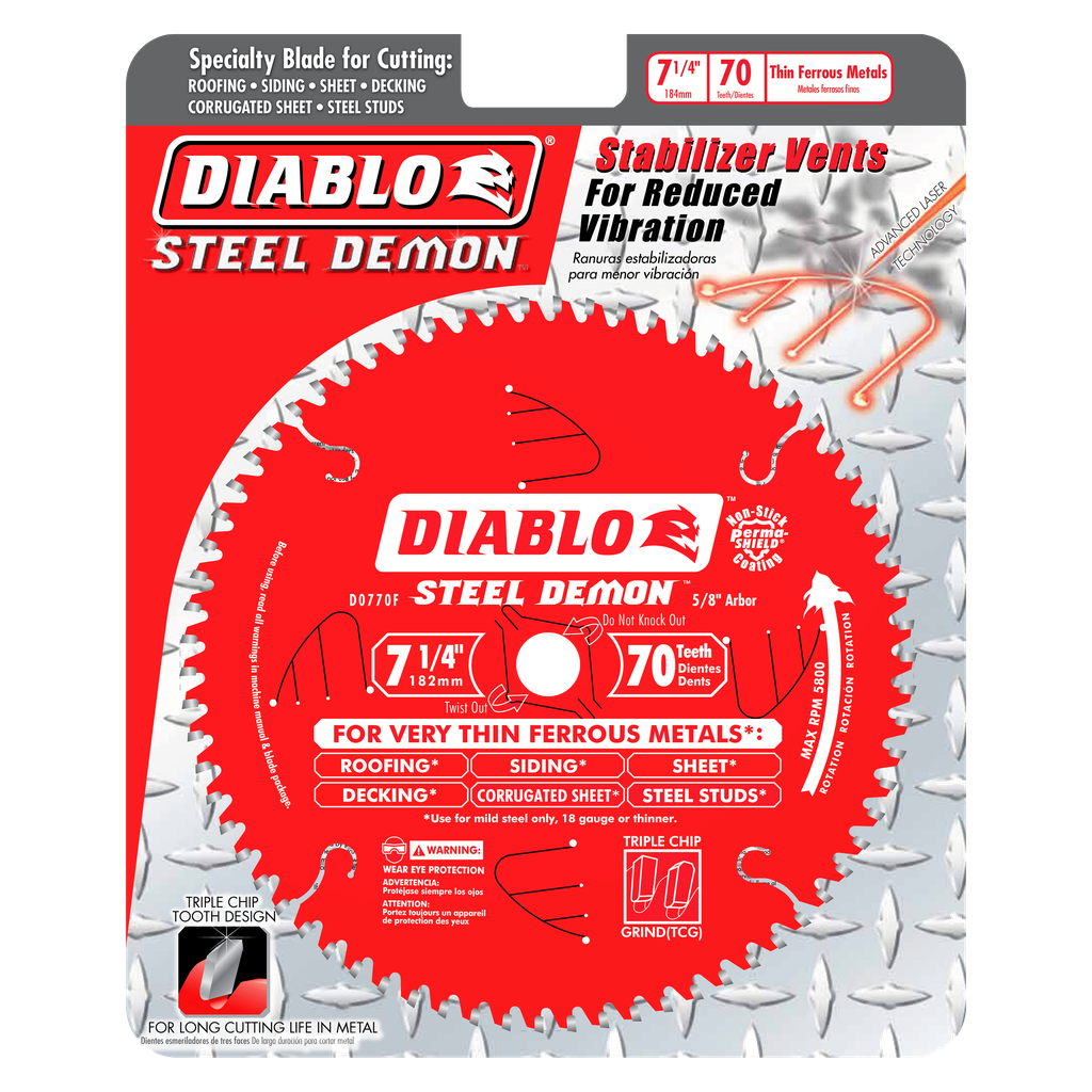 Steel Demon saw blades are specially designed for the extreme demands of ferrous metal cutting; thereby enabling precise cuts without sparks, heat or burred edges that result from using abrasive blades. With up to 40X the life of standard abrasive disc, Steel demon delivers unparalleled performance and superior quality cuts. Blades feature Freud’s TiCo Hi-Density Carbide, Laser cut bodies, Anti-vibration technology, Perma-Shield Non-Stick Coating, Triple Chip Design, and pretensioned blades. Diablo’s blade is designed to fit 7-1/4-Inch Circular Saws.