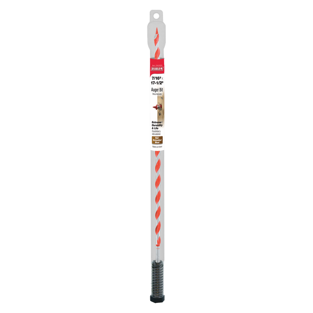 Diablo’s Auger Bit range provides maximum performance, extreme durability and superior life in nail-embedded wood applications. A two-step cutting action creates holes that are precise and clean. The self-feeding Dura-Tip™ pulls the bit while the dual cutting edge delivers an effortless, smooth drilling experience in wood with nails. Deep flutes enhance the chip evacuation process for more holes per charge. Quick change shank increases stability and durability in cordless and corded impact wrenches and drill drivers.