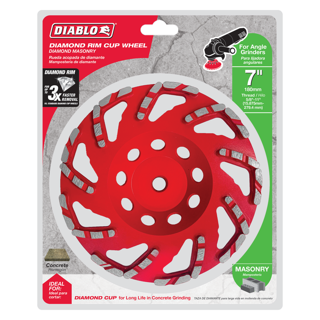 Engineered for optimal performance in masonry applications, this 7-inch diamond cup wheel from Diablo Tools is an essential tool for professionals and enthusiasts alike. It features strategically designed L-shaped diamond segments that not only provide a clean and smooth finish but also ensure swift grinding action and an extended wheel life. With extra-wide slots, this cup wheel promotes efficient dust extraction, keeping your workspace cleaner while maximizing productivity. Designed for dry grinding on concrete, its optimized diamond distribution offers consistent performance, making it ideal for all your concrete grinding needs.
