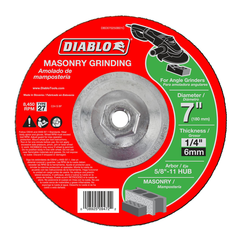 Diablo’s premium masonry grinding discs provide superior performance and increased productivity. Featuring a premium silicone carbide blend, these discs grind through material faster than other discs and offer an extra long grinding life. Fully reinforced for use in hand-held cut-off work. Ideal for use when working in hard to reach areas.