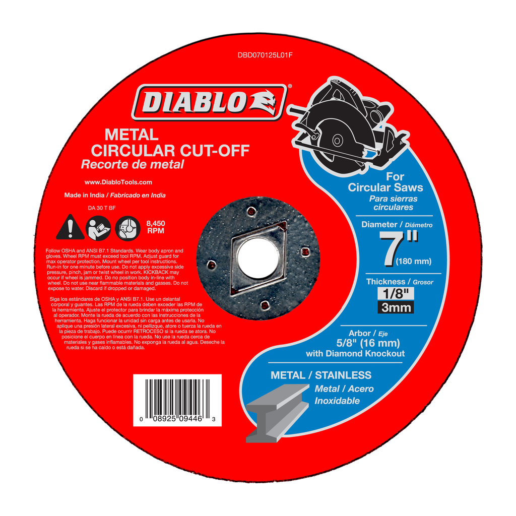 Experience precision cutting with the 7-inch Metal Circular Cut Off Disc from Diablo Tools, expertly designed for a range of metal applications including steel, stainless steel, cast iron, and sheet metal. This high-performance disc features a premium aluminum oxide blend that not only ensures rapid material removal but also enhances durability for a longer cutting life. With a robust construction suited for tasks like cutting angle iron and rebar, it is optimized to operate effectively at a maximum speed of 8,450 RPM, making it an essential tool for any metalworking project. Ideal for both professionals and DIY enthusiasts, this cut-off disc delivers reliable results every time, streamlining your workflow and boosting productivity.
