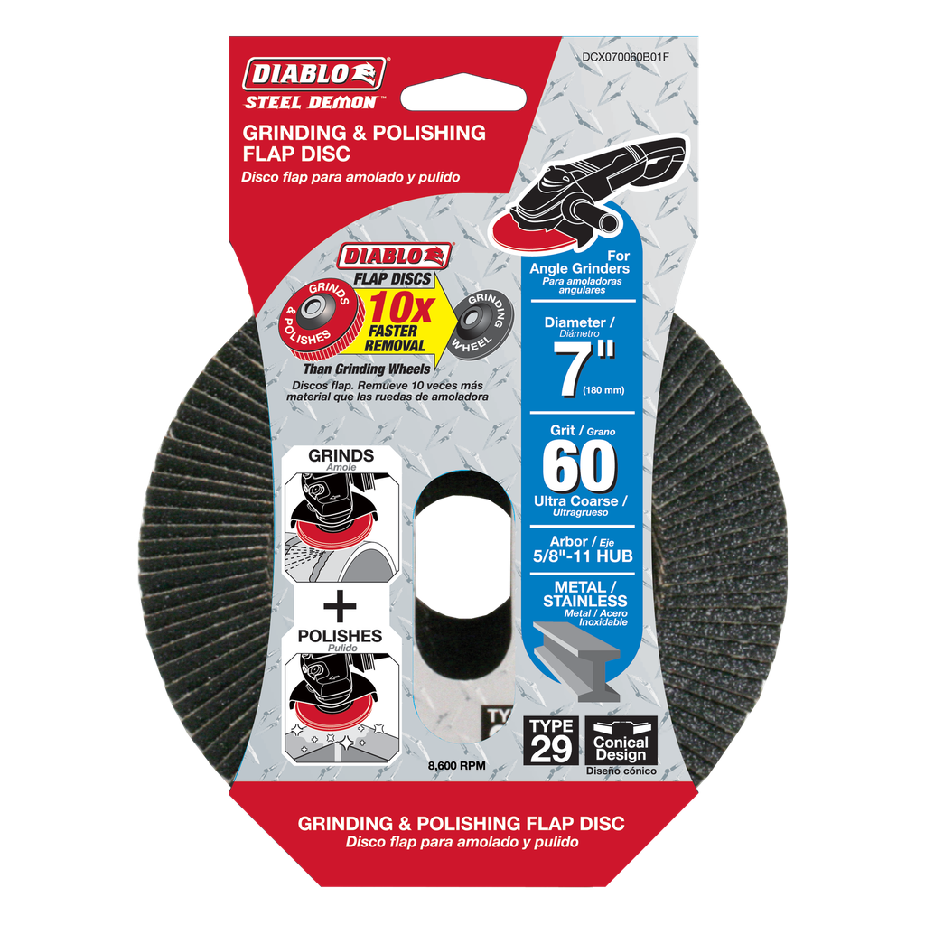 The 7-inch Steel Demon Flap Disc by Diablo Tools offers a highly efficient solution for metalworking tasks, featuring a premium zirconium blend designed to provide fast material removal and extended sanding life. With a conical, Type 29 design, it excels in applications such as polishing and grinding steel bar, cast iron, rebar, and angle iron, making it an invaluable tool for professional craftsmen and DIY enthusiasts alike. Capable of delivering material removal speeds up to ten times faster than traditional grinding wheels, this flap disc operates at a maximum RPM of 8,450, ensuring that you can tackle even the toughest jobs with ease. The 5/8″-11 arbor compatibility makes it convenient for use with a variety of angle grinders, promoting versatility in your workshop or project space.
