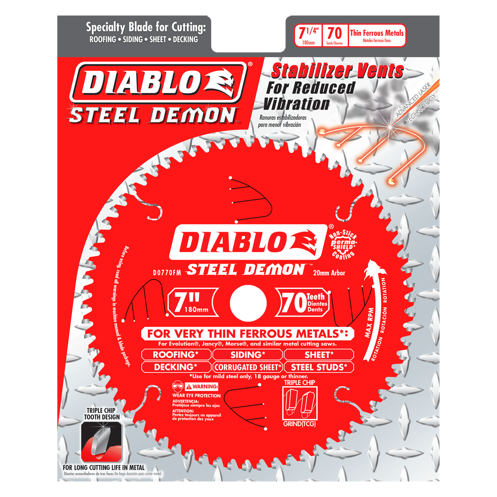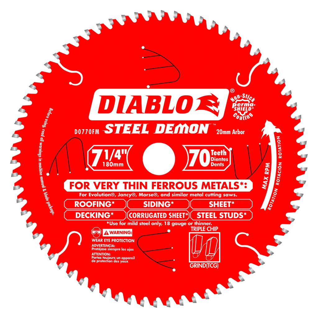 Steel Demon saw blades are specially designed for the extreme demands of ferrous metal cutting; thereby enabling precise cuts without sparks, heat or burred edges that result from using abrasive blades. With up to 40X the life of standard abrasive disc, Steel demon delivers unparalleled performance and superior quality cuts. Blades feature Freud’s TiCo Hi-Density Carbide, Laser cut bodies, Anti-vibration technology, Perma-Shield Non-Stick Coating, Triple Chip Design, and pretensioned blades. Diablo’s blade is designed to fit Evolution , Jancy , Morse , and Similar Metal Cutting Saws.