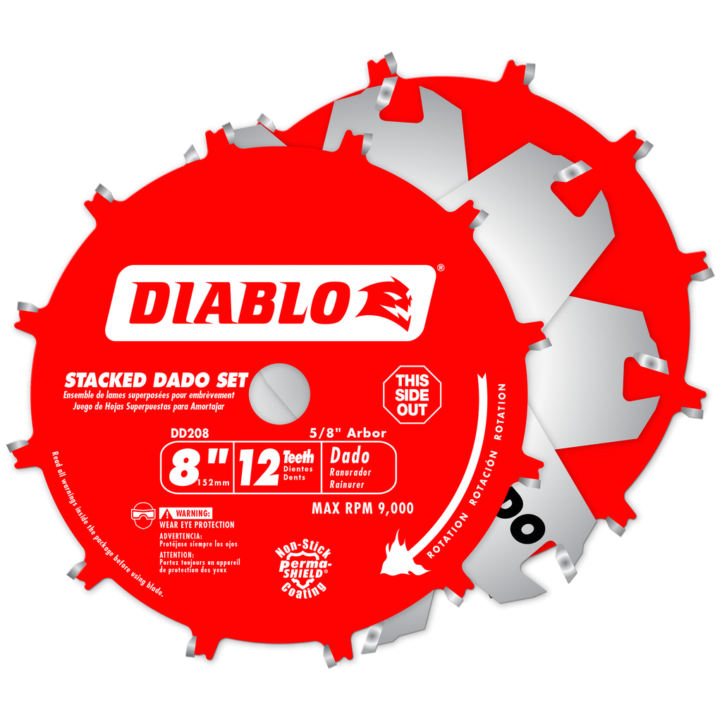 Make splinter-free cuts and flat bottom grooves with Diablo’s 8 in. x 12 Tooth Carbide Stacked Dado Saw Blade Set. The set includes blades, wing chippers and shims & are designed to fit 5/8 in. laser cut arbors for accurate blade rotation. The negative hook angles make flat bottom grooves and virtually splinter-free cuts. It has two outside blades with three two wing chippers. Diablo’s makes it ideal for underpowered saws because it requires less power to feed.