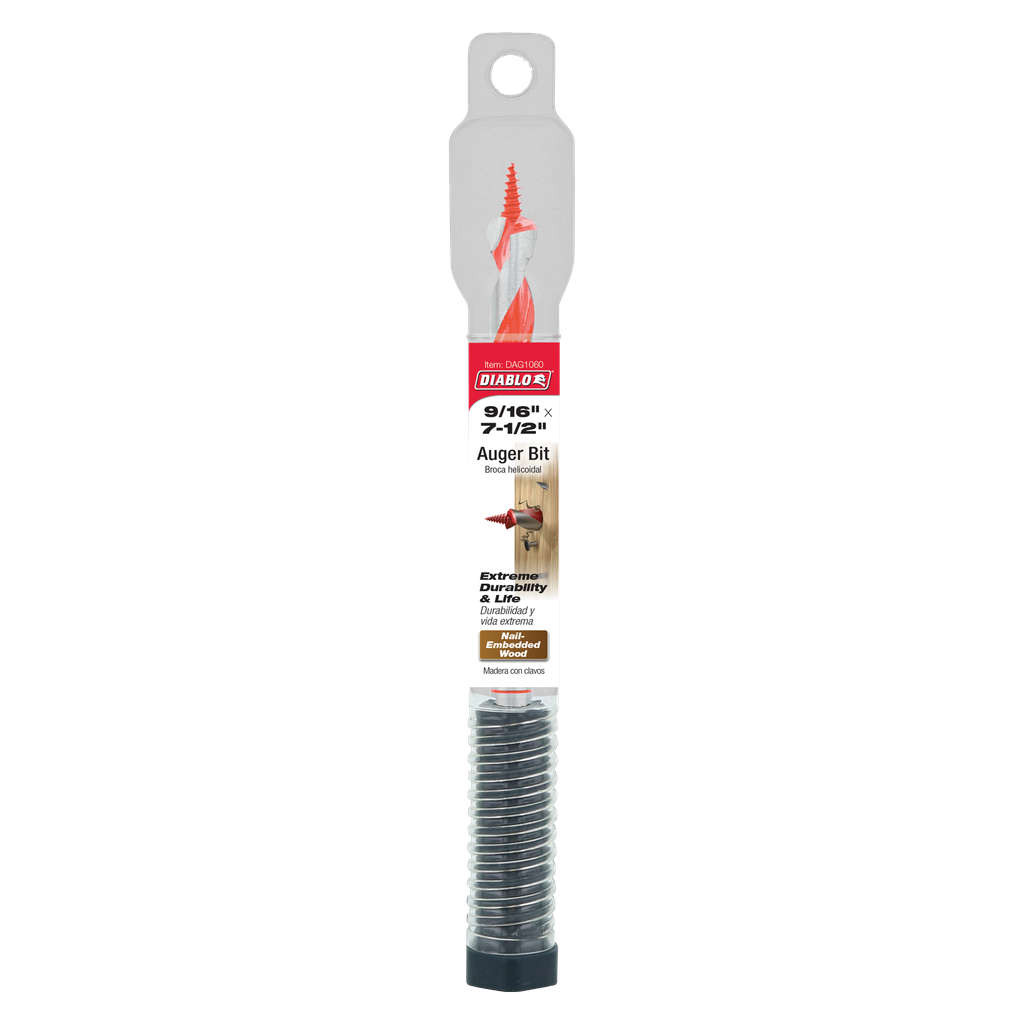 Diablo’s Auger Bit range provides maximum performance, extreme durability and superior life in nail-embedded wood applications. A two-step cutting action creates holes that are precise and clean. The self-feeding Dura-Tip™ pulls the bit while the dual cutting edge delivers an effortless, smooth drilling experience in wood with nails. Deep flutes enhance the chip evacuation process for more holes per charge. Quick change shank increases stability and durability in cordless and corded impact wrenches and drill drivers.