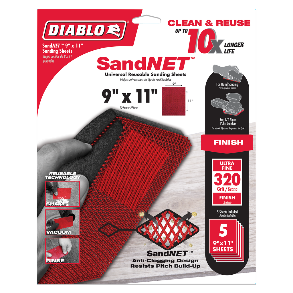 Diablo’s SandNET™ sheets with reusable sanding technology are the most advanced sanding sheets on the market with up to 10x longer life versus standard coated sanding sheets. The universal net design can be used when hand sanding or cut of fit your tool. Each SandNET™ sheet features a clog-reducing nylon net design coated in a premium ceramic blend grit for fast material removal while reducing material build-up. The SandNET™ design is easy to clean and reuse multiple times by simply shaking, vacuuming, or rinsing the sheet to remove any pitch build-up.