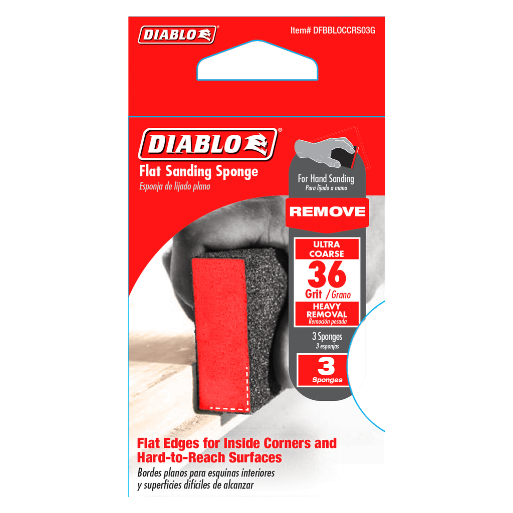 Diablo’s premium flat edge sanding sponges include break-through innovations for superior sanding performance, extended sanding life and increased hand-sanding productivity. Featuring a premium aluminum oxide blend, these flat sanding sponges remove material faster and offer up to 3X longer sanding life versus standard hand sanding sheets. The flat edges make it easy to access inside corners and hard to reach surfaces. The full contact design provides maximum sanding potential by delivering consistent scratch patterns and ultra-smooth finishes. The superior grain bonding system, ENDURA-BOND™, provides Diablo’s sanding blocks with longer life and extreme durability.