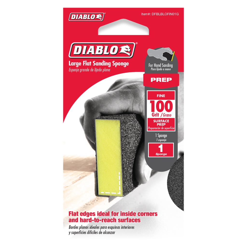 Diablo’s premium flat edge sanding sponges include break-through innovations for superior sanding performance, extended sanding life and increased hand-sanding productivity. Featuring a premium aluminum oxide blend, these flat sanding sponges remove material faster and offer up to 3X longer sanding life versus standard hand sanding sheets. The flat edges make it easy to access inside corners and hard to reach surfaces and the longer length allow for sanding medium surface areas. The full contact design provides maximum sanding potential by delivering consistent scratch patterns and ultra-smooth finishes. The superior grain bonding system, ENDURA-BOND™, provides Diablo’s sanding blocks with longer life and extreme durability.