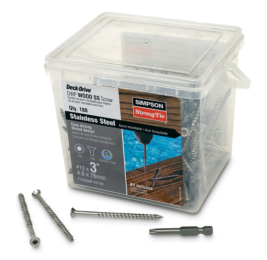 The Deck-Drive DWP Wood SS screw is a powerful fastening solution for deck, dock and general exterior applications where extra corrosion protection is needed. With its specially designed sharp-point and unique box-threads, the DWP is ideally suited for the majority of wood used in today’s deck boards. DWP screws are also offered in a variety of sizes to fasten fascia and trim.