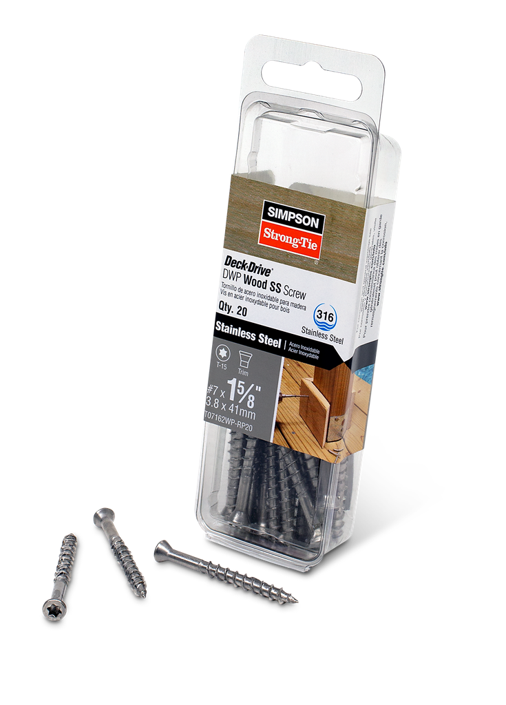 Engineered for exceptional performance, the Simpson Strong-Tie Deck-Drive™ DWP Wood Screws are a reliable choice for your decking needs. These #7 x 1-5/8 inch screws feature a specially designed sharp point that easily penetrates hard wood products, ensuring a secure hold. The unique box thread design, enhanced with raised-ridge technology, significantly reduces driving torque, allowing you to drive more screws with a single battery charge and increasing efficiency on the job. Crafted from Type 316 stainless steel, these screws offer superior corrosion resistance, making them ideal for use in a variety of outdoor applications. Additionally, the six-lobe drive design minimizes the risk of bit cam-out, providing a smoother driving experience and extending the life of your tools. A trim head design options ensures a clean finish, making these screws not only functional but aesthetically pleasing as well.