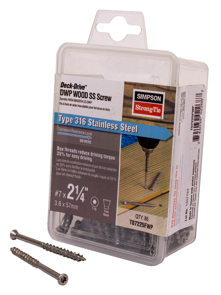 Engineered for exceptional performance in challenging applications, the Simpson Strong-Tie Deck-Drive DWP Wood Screw is crafted from Type 316 stainless steel, ensuring outstanding corrosion resistance suitable for marine and high-moisture environments. Its specially designed sharp point allows for effortless penetration into hard wood, while the unique box thread design with raised-ridge technology minimizes driving torque, enabling you to drive more screws per battery charge. The 6-lobe drive feature helps to prevent bit cam-out, enhancing the ease of use and extending the life of your driver bits. This trim head option is versatile and also available in a flat-head version, making it an ideal choice for a range of decking and woodworking projects.