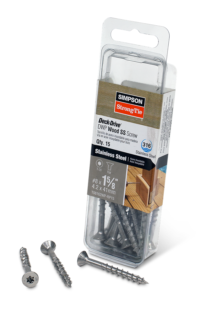 Engineered for outstanding performance in outdoor applications, these Simpson Strong-Tie Deck-Drive™ DWP WOOD Screws are made from Type 316 stainless steel, providing exceptional corrosion resistance even in severe environments. Their specially designed sharp point allows for effortless penetration into hard wood products, while the unique box thread design with raised-ridge technology minimizes driving torque, enabling you to drive more screws per battery charge. With a flat head that supports a clean finish, these screws also come with a T20 6-lobe drive that helps prevent bit cam-out, prolonging the life of your driver bit. Whether you’re working on decks, fences, or other outdoor structures, this product is meticulously designed for reliability and efficiency.