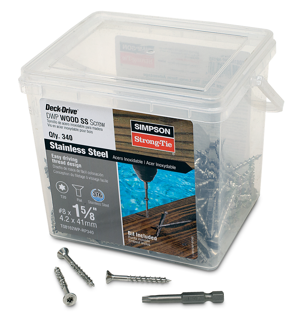 The Deck-Drive DWP Wood SS screw is a powerful fastening solution for deck, dock and general exterior applications where extra corrosion protection is needed. With its specially designed sharp-point and unique box-threads, the DWP is ideally suited for the majority of wood used in today’s deck boards. DWP screws are also offered in a variety of sizes to fasten fascia and trim.