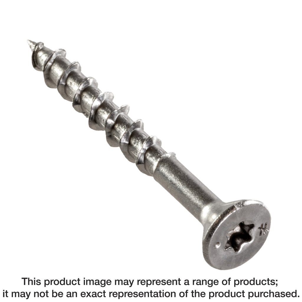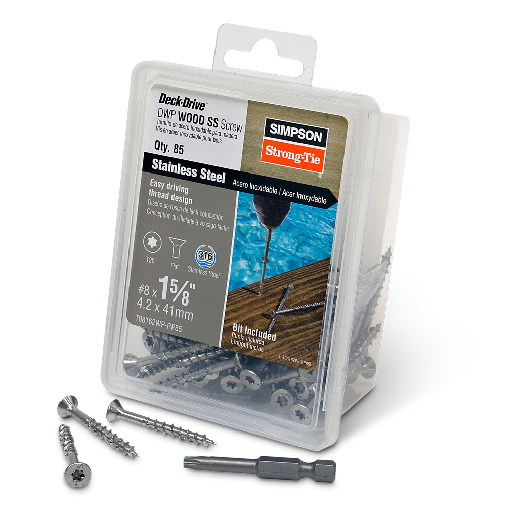 The Simpson Strong-Tie Deck-Drive™ DWP Wood SS Screw combines exceptional engineering with high-quality materials, making it an essential choice for any decking project. Featuring a #8 x 1-5/8 inch size and crafted from Type 316 stainless steel, these screws offer severe-level corrosion resistance, ensuring lasting performance even in challenging environments. The flat head design, along with the included T20 6-lobe drive bit, not only enhances the ease of installation but also helps prevent cam-out, promoting reliable driving and extending bit life. Additionally, the screw’s unique thread design significantly reduces driving torque, allowing you to accomplish more work on a single battery charge, making it a practical solution for both professionals and DIY enthusiasts alike.