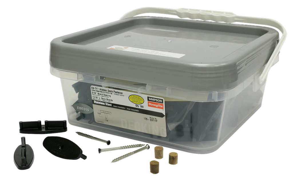 The EB-TY provides a unique method of fastening deck boards that makes the fasteners virtually invisible. Fastening is done into the side of the board, leaving a fastener-free deck surface. The EB-TY is a polypropylene biscuit fastener that fits into a slot the builder cuts into the edge of the deck boards with a standard biscuit joiner. The EB-TY fasteners are inserted and fastened with a screw driven into the joist. Nesting each successive board against the EB-TY automatically ensures consistent spacing and uniform height.