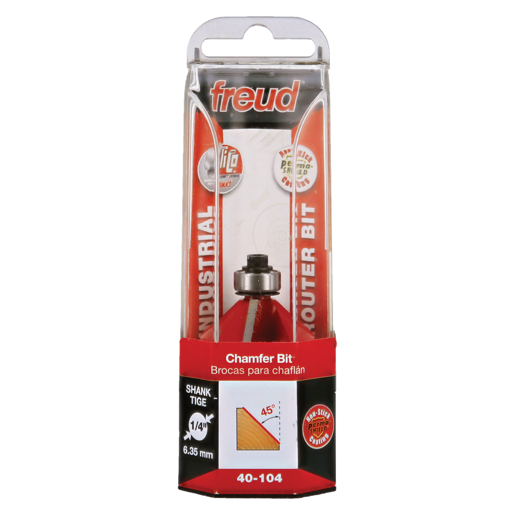 The chamfer profile seems simple, but it is a great solution for lots of multiple-sided projects, joinery, and easing edges. Creates a uniform chamfer on the edge of any work piece to add character, while retaining crisp geometric lines. #40-094 makes 16-sided pieces and #40-098 makes 12-sided pieces. Routs hardwood, softwood, plywood and composites; use in hand-held or table-mounted portable routers.