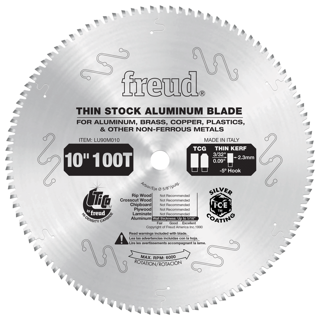 This blade produces a smooth, burr-free finish when cutting thin aluminum, brass and other non-ferrous metal extrusions. A high tooth count with a -5° hook angle allows the teeth to slice efficiently through the material without binding. The requirements on the cutting edge greatly differ with nonferrous metals than with cutting wood. With this in mind, Freud formulated a special carbide with high impact strength for this blade. Freud recommends use of a liquid lubricant when cutting non-ferrous materials. This can be accomplished with a spray of WD-40 or other similar type of lubricant every 4 or 5 cuts. Wax sticks are not recommended.