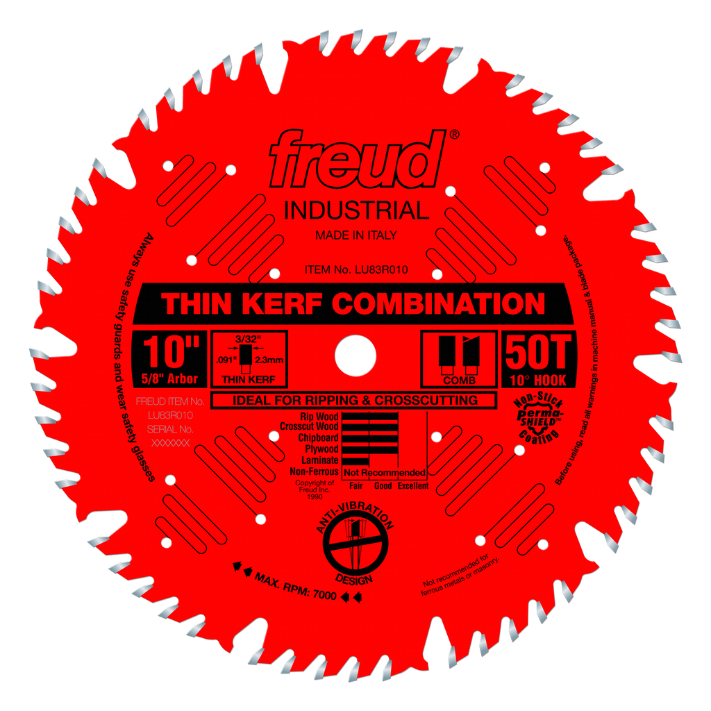 The ultimate combination blade is now available in a thin kerf design for less amp draw and reduced material waste. This ultimate combination blade combines one flat tooth for ripping, followed by four alternate top bevel teeth for crosscutting and a large gullet for effective chip clearance. This blade also features laser cut anti-vibration slots, practically eliminating the vibration that resonates in standard blades. With this ultimate combination blade, there is no need for stabilizers.