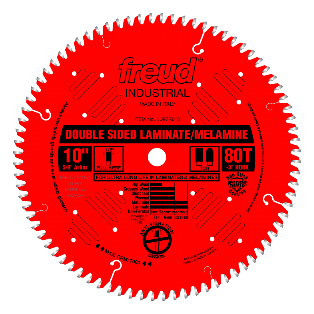 Designed to give long life and excellent finish on the top and bottom of laminates, melamine & veneered plywood. The laser-cut anti-vibration design yields the plate acoustically dead. This reduces the sideways movement of the cutting edge to prevent chipping in manmade materials such as laminates. This dramatically extends cutting life and finish. No scoring blades needed with this blade!