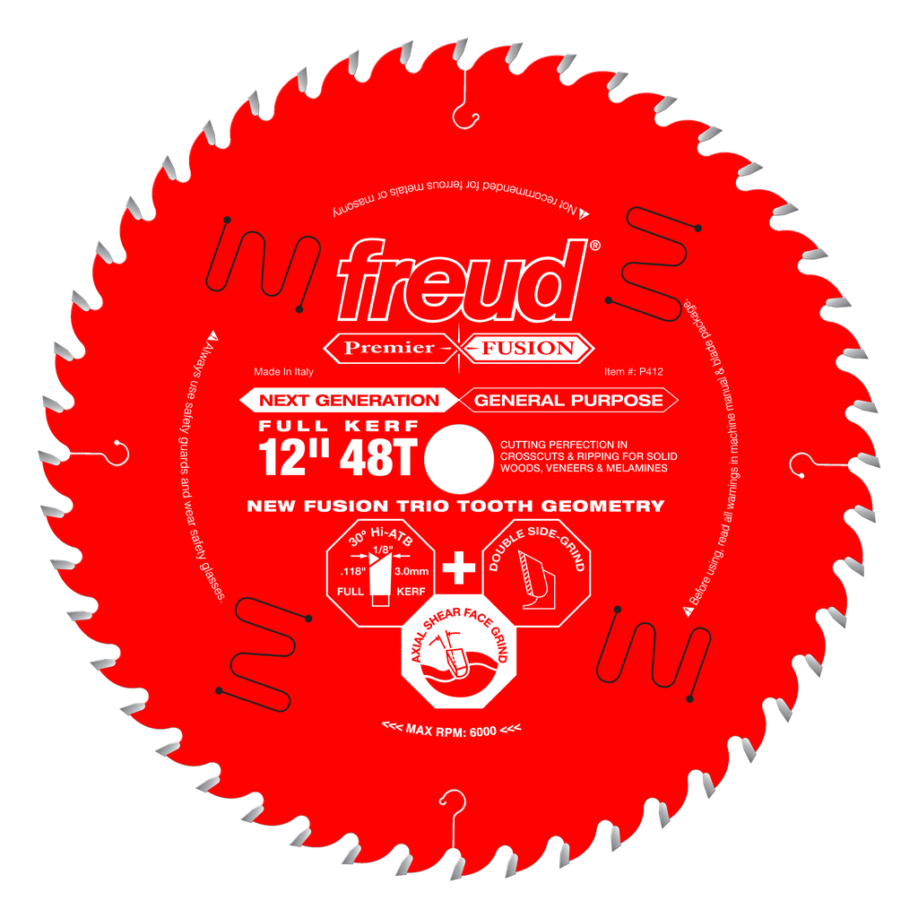 Freud’s Next Generation Premier Fusion featuring the radical new Fusion Trio Tooth Design is the most technologically advanced general purpose blade on the market! Freud has designed these unique blades with a new radical tooth design called “Fusion Trio” which combines a special grind for the top, sides, and face of each tooth. This one-of-a-kind tooth geometry includes a 30 degree Hi-ATB, a double grind design, and an Axial Shear Face Grind to produce the ultimate polished finish in ripping and crosscutting applications with minimal resistance as it glides through in the material. Whether you’re ripping or crosscutting, the next generation Premier Fusion blade is the best for flawless cuts in laminates, melamine, veneered plywoods, hardwoods, softwoods, and thick stock lumber.