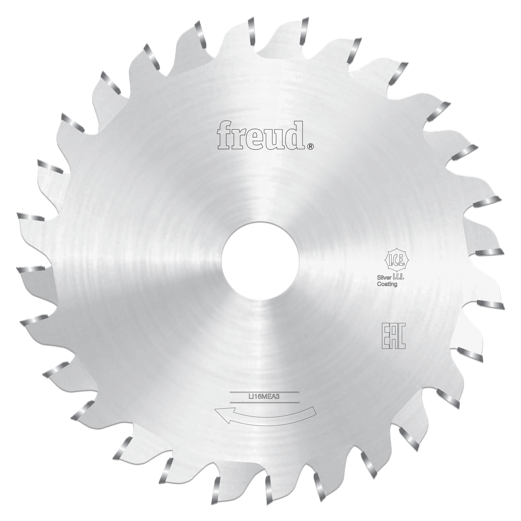 Designed for precision in cutting coated panels, the 125mm Split Scoring sawblade by Freud Tools employs a Silver I.C.E. Coating, ensuring a cleaner and cooler operating experience by preventing blade build-up. This sawblade features an ATB tooth design with a 5-degree positive cutting angle, making it ideal for various materials, including melamine, veneered plywood, and MDF. Its adjustable kerf allows for thickness adjustments directly controlled by the machine, eliminating the need for spacers. With 14+14 teeth and a robust 20mm arbor, this scoring sawblade offers efficiency and reliability for professional-grade cutting on sizing machines.