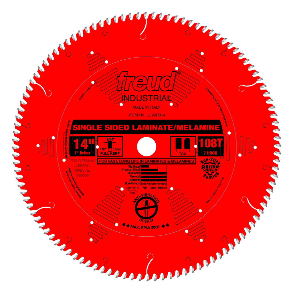 This fast-cutting blade is ideal for a perfect finish on one side of laminates and melamines. The Perma-SHIELD™ coating makes these blades resistant to friction and heat build-up. Coated blades pull 1/3 less on the saw, which translates into 33% more cutting power. The 7° hook angle and a triple chip grind provide fast cuts and long cutting life