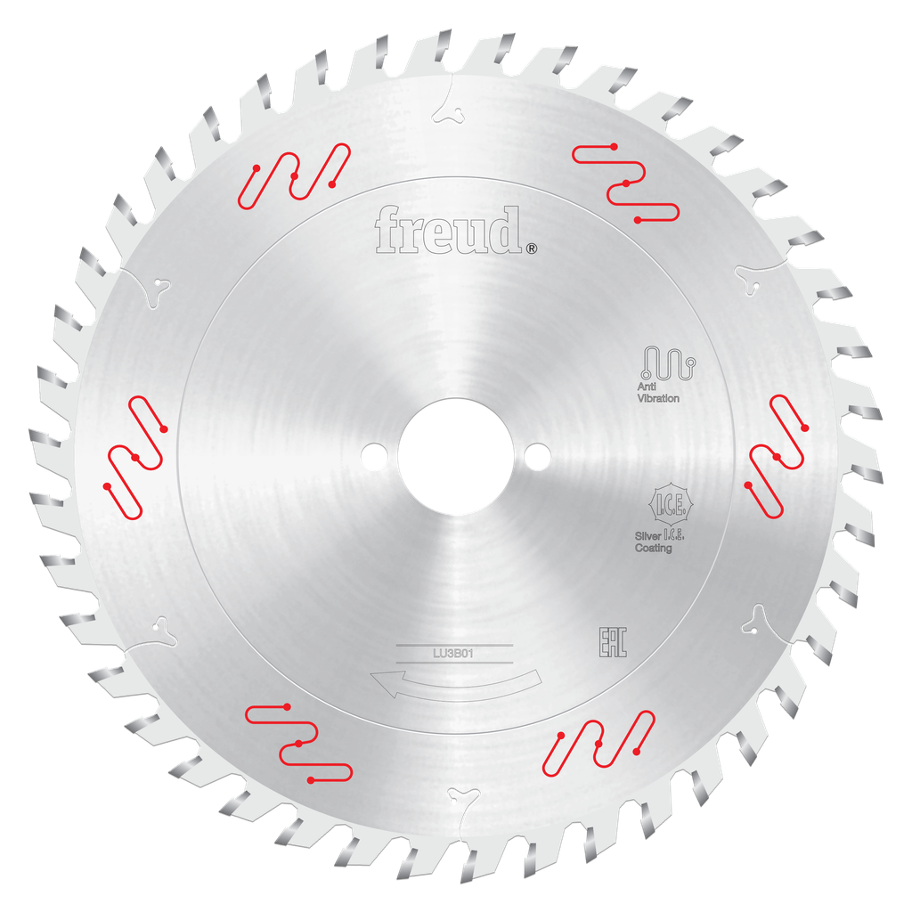 Engineered for precision and versatility, this 220mm panel sizing blade is designed specifically for sliding table saws, making it an essential tool for woodworking professionals. It features a specialized conical triple chip tooth design with a concave face and a positive cutting angle, ensuring clean, efficient cuts through various materials, including veneered plywood, melamine, and laminate. The silver I.C.E. coating plays a crucial role in maintaining optimal performance; it reduces build-up on the blade surface, allowing it to operate cooler and cleaner over extended use. With its anti-vibration design and 42 teeth configuration, this blade provides smooth, controlled cutting while reducing noise and enhancing overall user experience, making it ideal for both wood panels and non-ferrous metals.