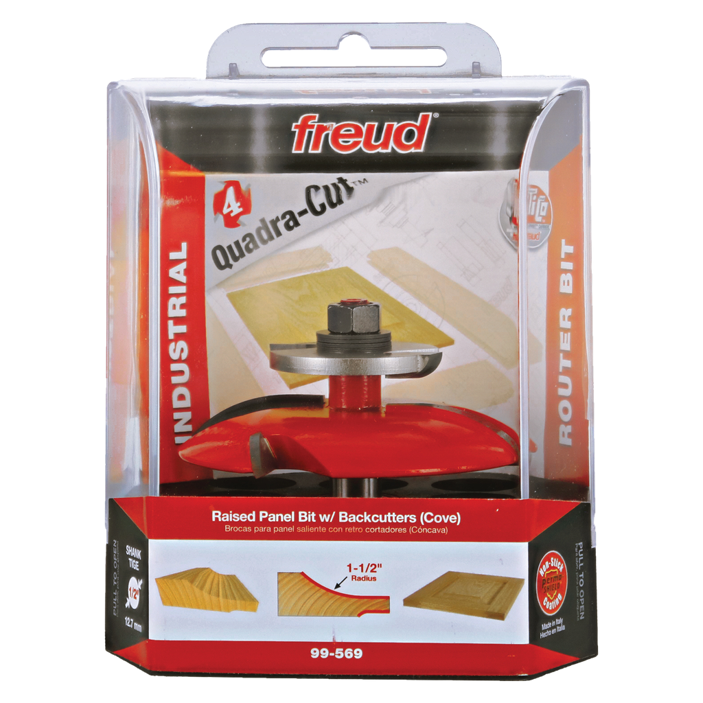 These Raised Panel Bits include a backcutter that routs a rabbet on the back of the door panel, resulting in a 3/4″-thick panel that sits flush with the doorframe for a professional, architecturally correct appearance. Shims are included to allow adjustment of tongue thickness from 7/32″ to 1/4″ for maximum versatility and compatibility. Exclusive Quadra-Cut™ design includes two cutters that shear upwards and two edges shearing downward to deliver a flawless finish. Use in table-mounted routers with fence only. Suitable for hardwood, softwood or composite panels.