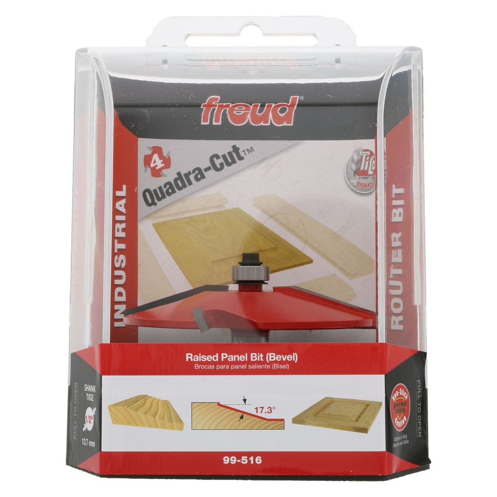 Freud’s huge selection of Raised Panel Bits are ideal for creating raised panels for doors, drawer fronts and paneling, as well as decorative tops, plaques and molding. All of these bits feature revolutionary Quadra-Cut™design combining two small wings that cut downward to shear the top edge for a splinter-free surface, and two large wings that shear upward for a smooth finish. As you select your bit, note that some bits feature a 1/2″ carbide height for use in 5/8″ thick panels, and others have a 5/8″ carbide height for 3/4″ thick panels. Use raised panel bits in table-mounted routers with a fence to rout hardwood or softwood panels.