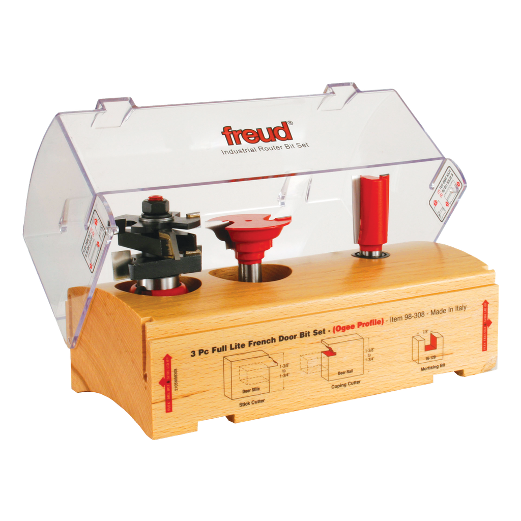 Build custom Full Lite or True Divided Lite French Doors in any size and from any wood species with Freud’s Three Piece French Door Sets. The Rail & Stile bits feature Freud’s unique design to produce tenons of any length for extra-strong joints, and the Mortising Bit works with the profile bits to rout joints for true divided light mullions and muntins. To create simulated divided lite grills, add on of Freud’s Two Piece French Door Grill Sets (sold separately). Sets are offered in Roundover (98-307), Ogee (98-308), and Cove & Bead (98-309) profiles. Use these bits in table-mounted routers to mill hardwood or softwood.