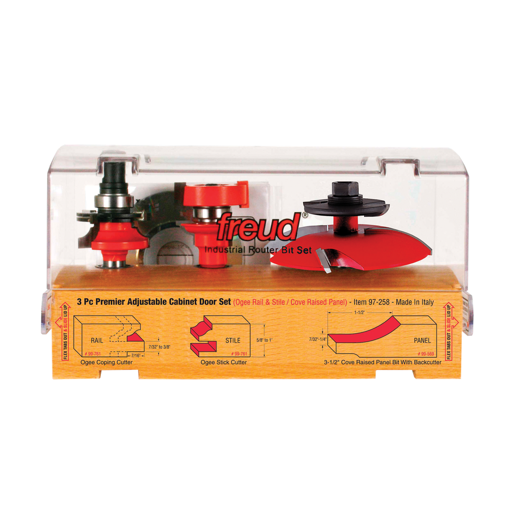 Freud 3 Piece Premier Adjustable Cabinet Bit Set, ogee & cove with backcutter profile #97-258