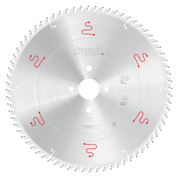 extremely precise cuts and virtually no-run out for up to 2X the cutting performance and cutting life of standard LSB Panel Blades. Freud’s specially formulated TiCo™ carbide along with Silver I.C.E. (Industrial Cooling Element) coating enables the blade to slice through materials, maximizing the blade’s cutting life and providing a superior quality finish. The Ultimate Precision Grinding Process provides the highest possible tolerance for precise, accurate cuts while the advanced Anti-Vibration Design combined with unmatched accuracy in saw blade flatness make this the quietest panel saw blade on the market.
