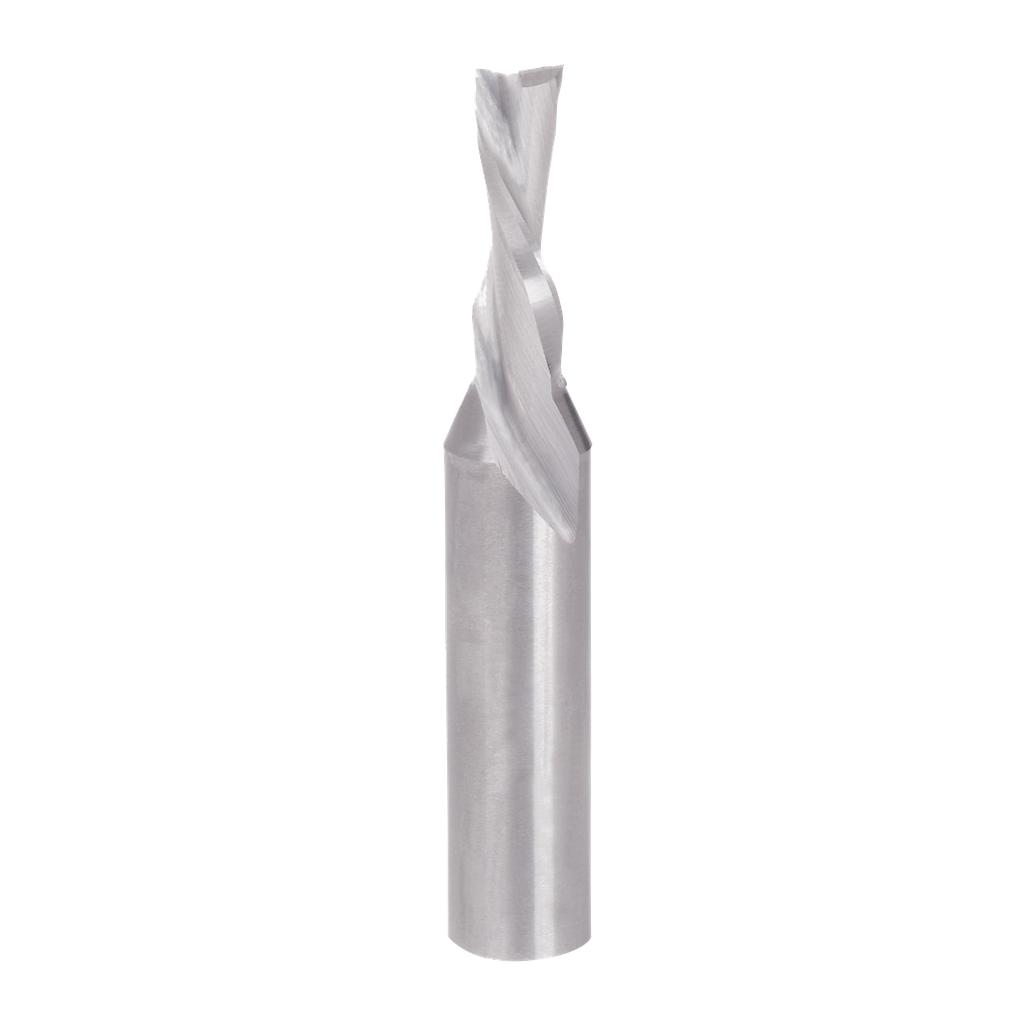 Down spiral bits are a great choice for grooves and dadoes in single-sided veneers and laminates where chip removal is not a problem, or for through-cuts where finish quality on the top surface is the primary consideration. Also cuts well in solid wood. Ideal for use in CNC routers. When used in hand-held or table-mounted routers, use care to keep router and work piece under control.