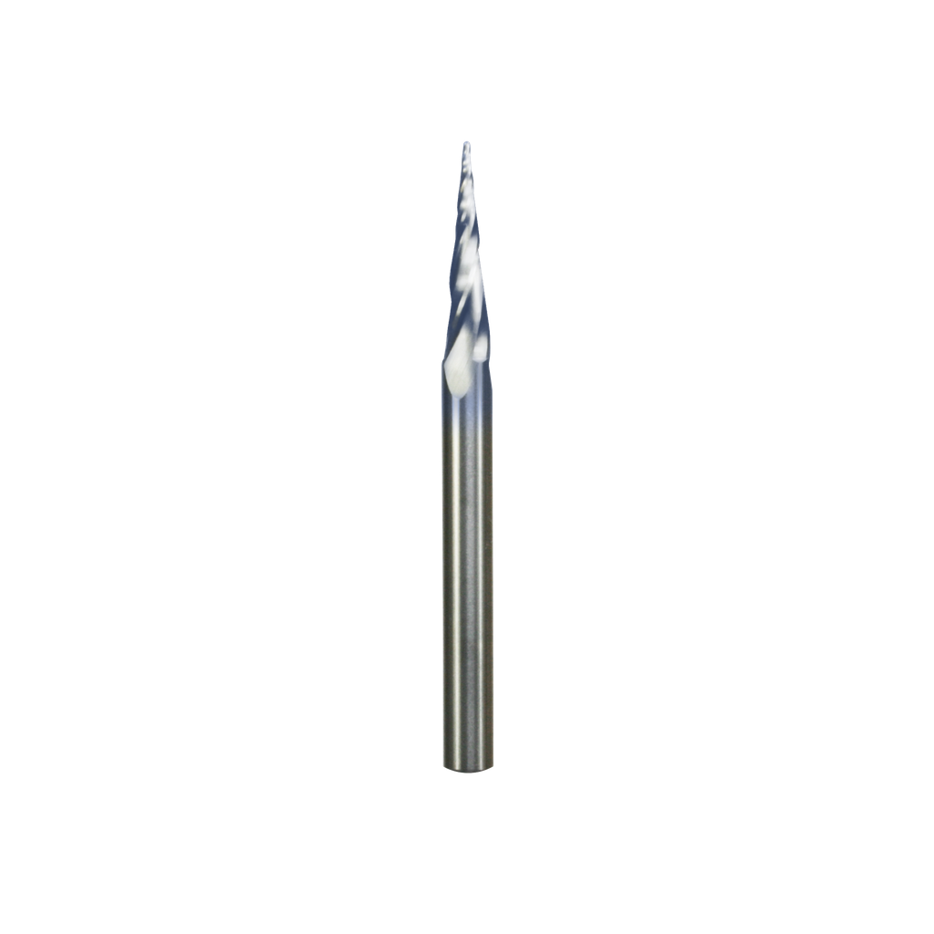6.2° x 1/32″ Tapered Ball Tip Solid Carbide Bit. Includes 3 flutes and 1/32″ diameter. 1/4″ Shank. This solid carbide carving bit features an extremely fine 1/32″ diameter tip for ultra-detailed cuts. The 3 flute design provides fast chip clearance in deep cuts.Ideal for Wood, Wood Composites, Plastics (Hard & Soft), and Aluminum for 2D and 3D Carving.