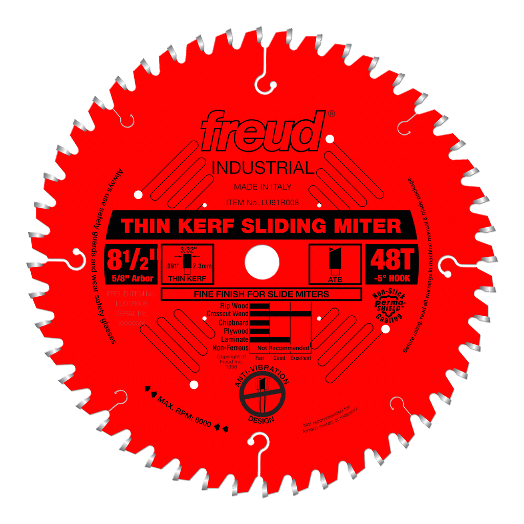 This thin kerf industrial blade provides a superior finish cut with sliding compound miter saws. The 5° negative hook angle helps prevent the blade from being too aggressive and pushes the work piece down and towards the fence. Thin kerf blades remove less material than standard carbide blades, thus requiring less horsepower to produce equally good results..