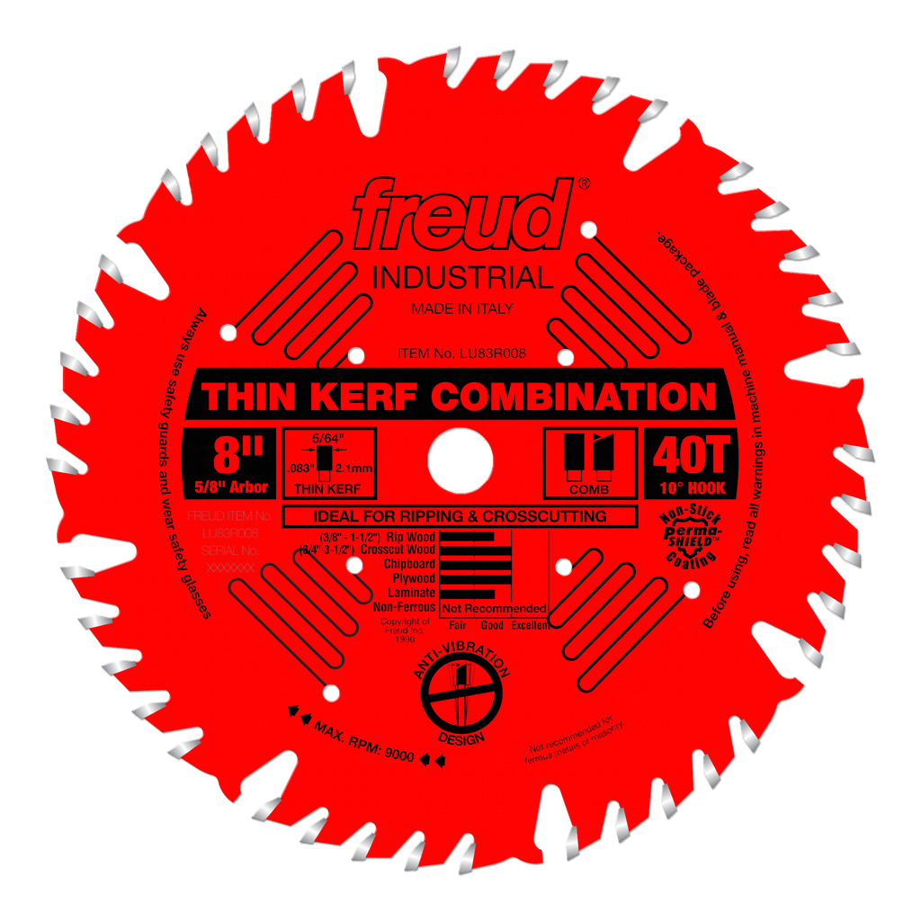 The ultimate combination blade is now available in a thin kerf design for less amp draw and reduced material waste. This ultimate combination blade combines one flat tooth for ripping, followed by four alternate top bevel teeth for crosscutting and a large gullet for effective chip clearance. This blade also features laser cut anti-vibration slots, practically eliminating the vibration that resonates in standard blades. With this ultimate combination blade, there is no need for stabilizers.