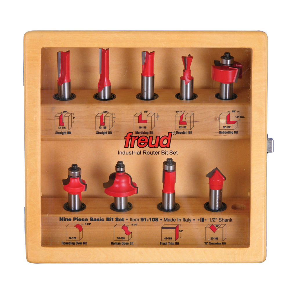 This is the ideal starter set for the beginning woodworker, and also makes a great investment for the experienced woodworker looking to refresh an existing bit collection. Offered in both 1/4″ and 1/2″ shank, the set includes a wide variety of bits: Straight, Mortising, Dovetail, Rabbeting, Rounding Over, Roman Ogee, Flush Trim and V-Grooving. Suitable for use with hand-held or table-mounted routers to cut hardwood, softwood, plywood or composites.