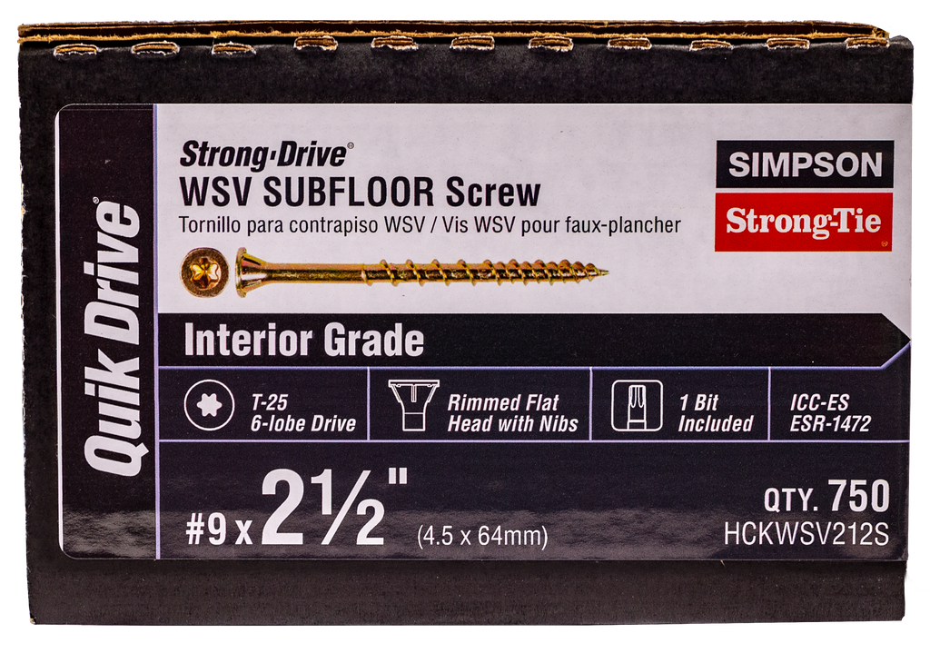 Simpson Strong-Tie® Strong-Drive structural fasteners are engineered and extensively tested to efficiently meet your most demanding wood and metal applications. The Strong-Drive family is designed to install easier than other fastening methods, which saves time and money. The WSV Subfloor screw was developed for fastening subfloor sheathing using the Quik Drive® auto-feed screw driving system. It has been re-engineered to reduce driving force and increase installation speed.