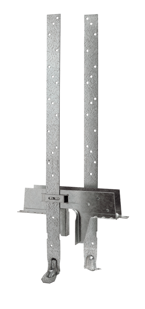 The DETAL20 is a high-capacity embedded truss anchor for attachment of single-ply trusses to concrete and masonry walls. It combines dual embedded anchors with a structural moisture-barrier seat that is partially embedded in the concrete or grout. This seat serves to protect the truss and also provides additional lateral and uplift capacity. The embedded anchors are pre-attached to the moisture barrier through slots that allow for a slight amount of adjustability, providing flexibility during installation to avoid rebar. The moisture-barrier seat includes tabs at each end for optional attachment to the form board in concrete tie-beam applications.