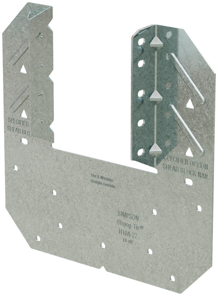 The H10A series holds the rafter or truss on both sides for higher uplift applications with embossments that add stiffness in crucial areas for improved performance. These U-shaped hurricane ties provide faster installation than using two single-sided ties. H10A models come with optional fastener holes to connect roof blocking to the top plate. Slots allow field bending up to a maximum pitch of 6:12 to accommodate angled blocking.