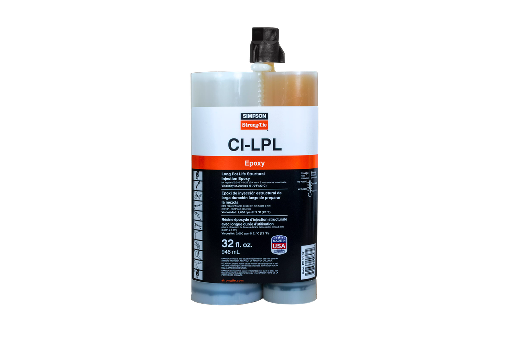 The CI-LPL Long Pot Life Structural Injection Epoxy from Simpson Strong-Tie is engineered for robust and enduring structural repairs. This 32 oz. cartridge provides a non-shrink formulation that bonds chemically with concrete, effectively sealing cracks against moisture and protecting reinforcing rods from corrosion. With a low surface tension, it penetrates narrow cracks even under pressure, making it ideal for both pressure injection and gravity-feed applications. Designed for versatility, this epoxy can be used on both dry and damp surfaces, and is formulated to perform even in hot environments, reaching up to 110°F. Adhering to rigorous standards set by ASTM C881 and AASHTO M235, it guarantees reliability and effectiveness for a variety of construction and repair tasks, while also being resistant to oils, salts, and mild chemicals.
