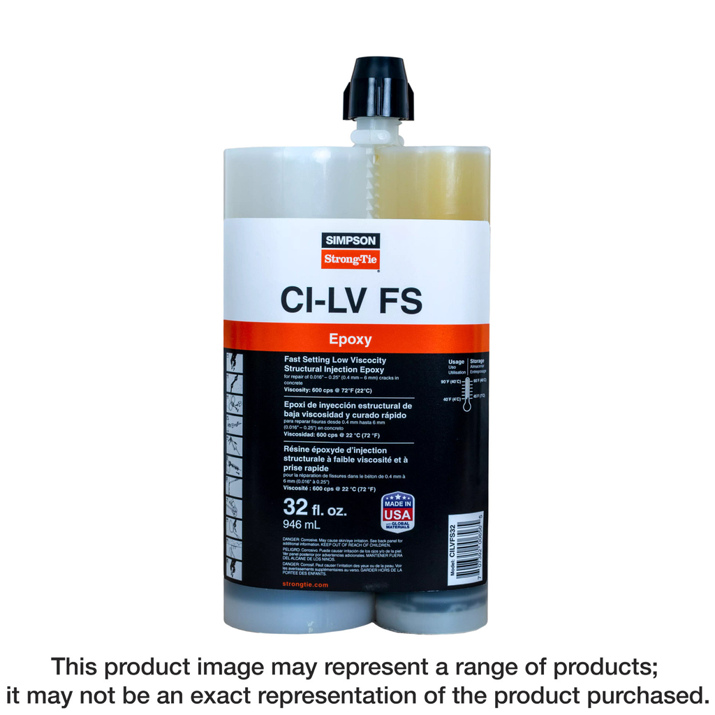 CI-LV FS Fast-Setting Low-Viscosity Structural Injection Epoxy is a two-component, high-modulus, high-solids, moisture-tolerant epoxy specially designed for pressure injection of concrete cracks and for increasing the bond between freshly placed repair mortars or concrete mixes and existing concrete when substrate temperatures are between 40°F (4°C)–90°F (32°C). Available in 3-gallon bulk kits or convenient side-by-side cartridges dispensed through a static mixing nozzle using either a manual or pneumatic dispensing tool.