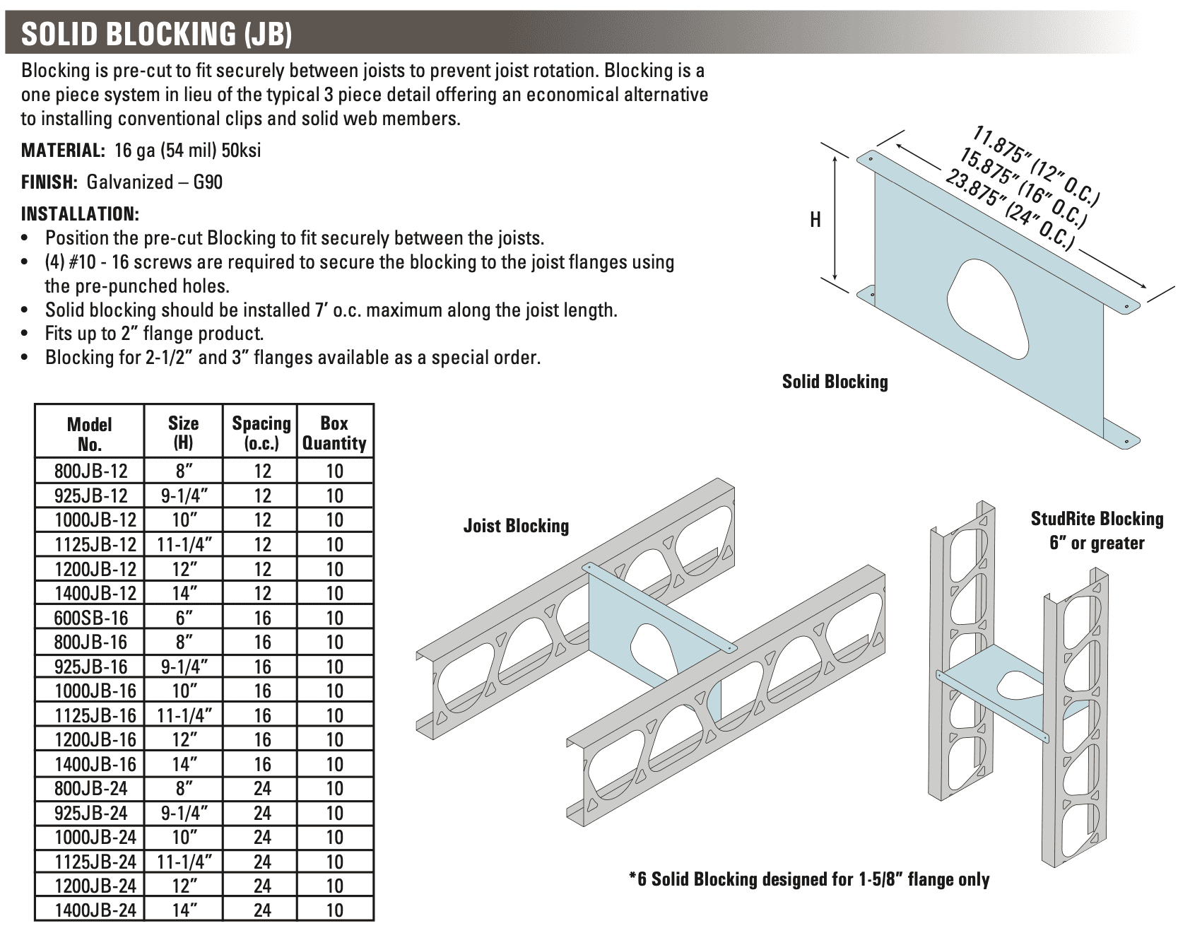 Joist Blocking is pre-cut to fit securely between joists to prevent joist rotation. Joist Blocking is a one piece system in lieu of the typical 3 piece detail offering an economical alternative to installing conventional clips and solid web members.