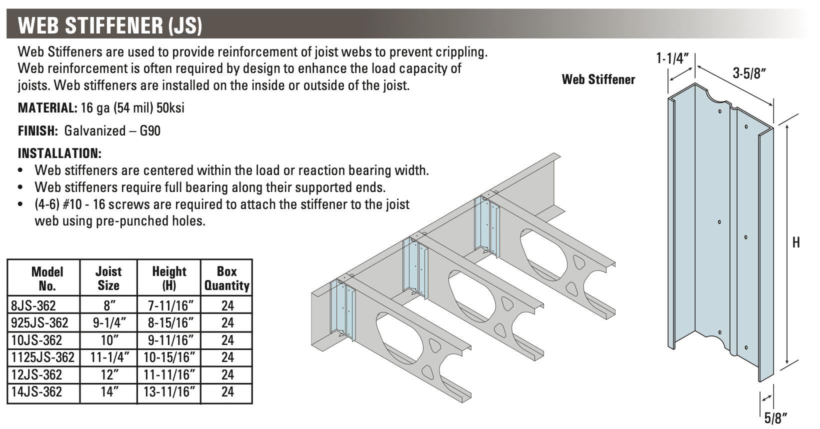 Web stiffeners are used to provide reinforcement of joist webs to prevent crippling. Web reinforcement is often required by design to enhance the load capacity of joists. Web stiffeners are installed on the outside of the C-joist.