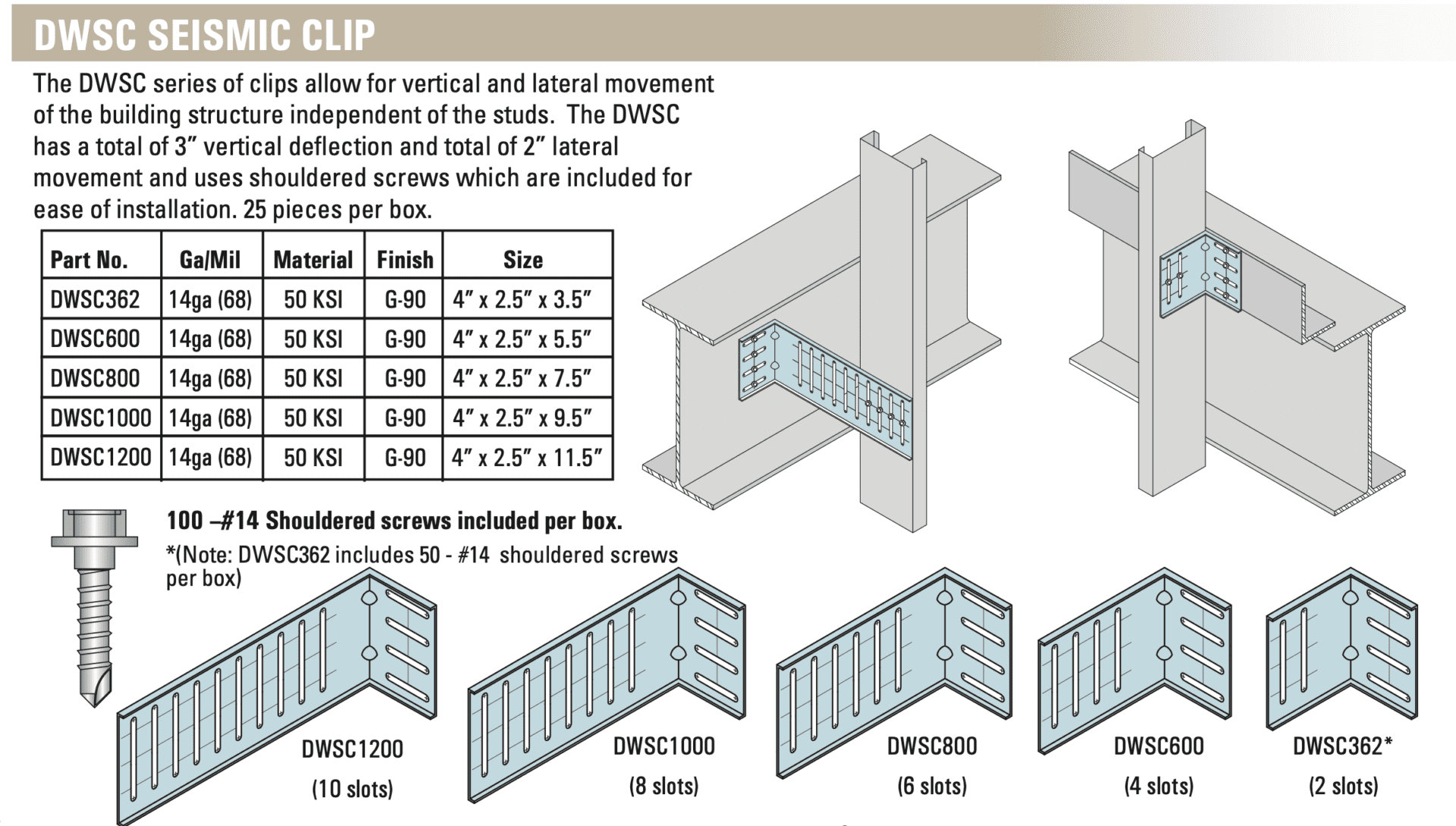 The DWSC series of clips allow for vertical and lateral movement of the building stucture independent of the studs. The DWSC has a total of 3? vertical deflection and a total of 2? lateral movement and uses shouldered screws which are included for ease of installation.