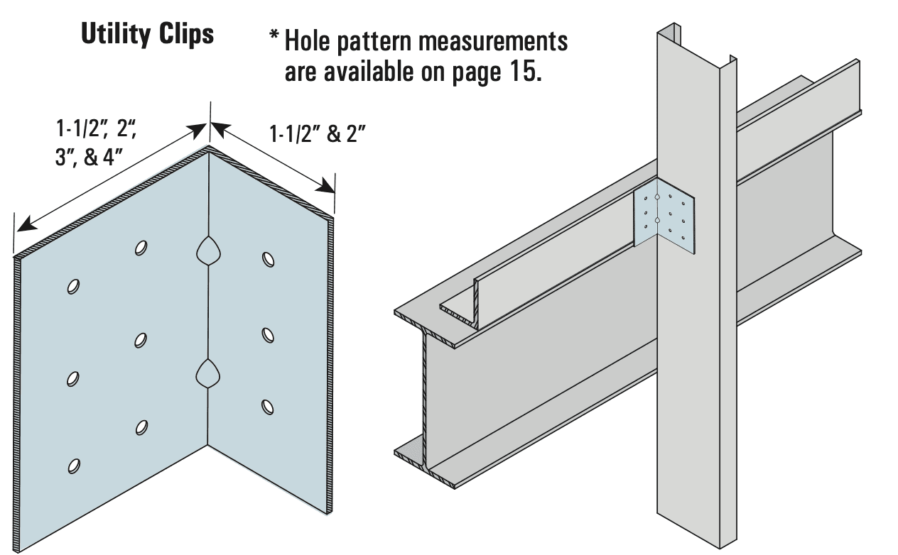 Utility Clips are used in a variety of framing applications including floors, walls and roofs. UA clips are pre-cut with pre-drilled holes for easy installation.