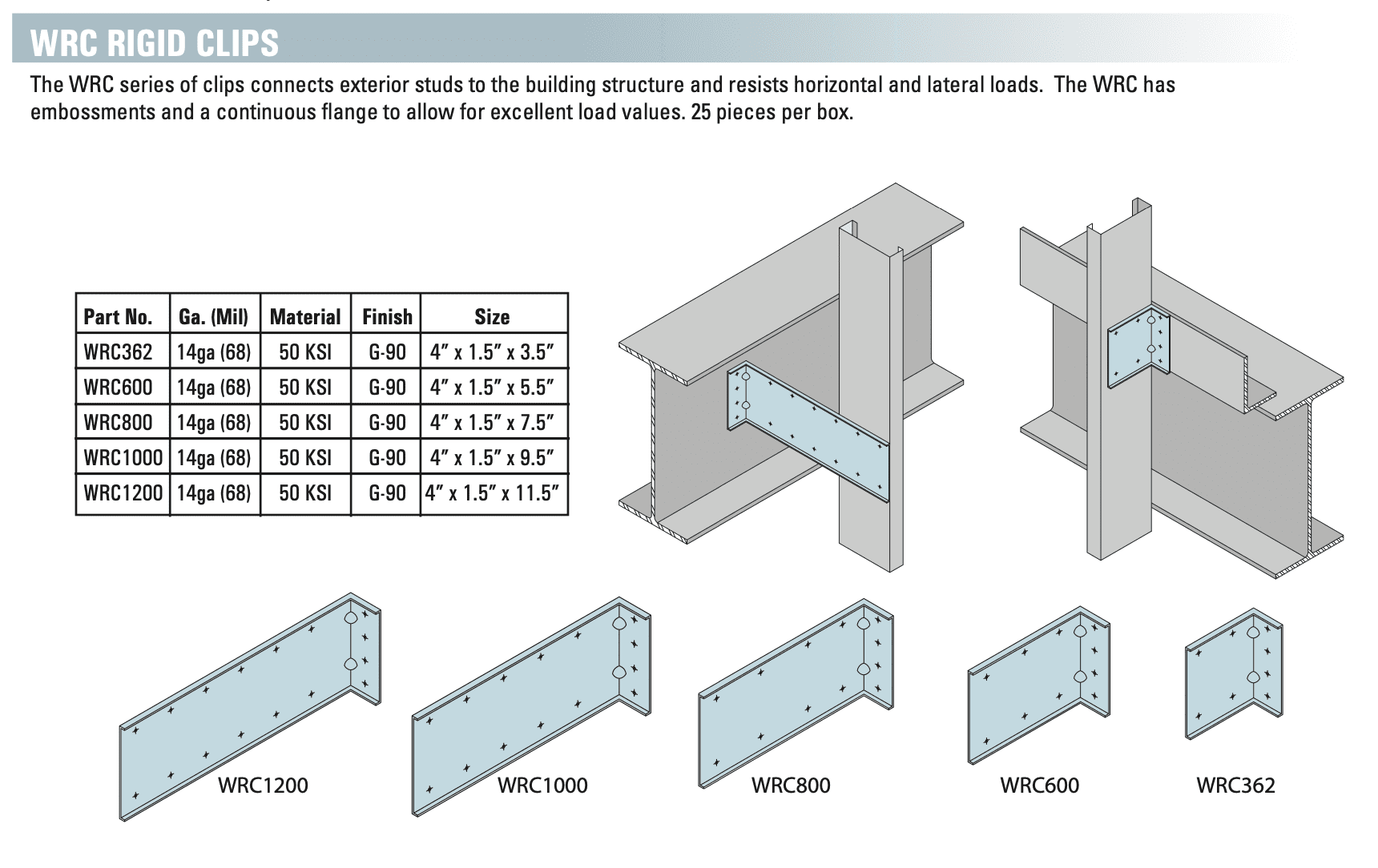The WRC series of clips connects exterior studs to the building structure and resists horizontal and lateral loads. The WRC has embossments and a continuous flange to allow for excellent load values.